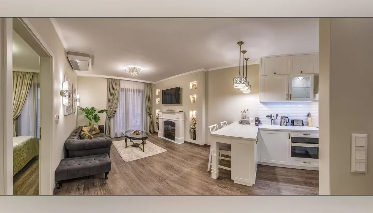 Apartamentul este dotat cu aer condiționat, pereți izolați fonic și intrare privată, asigurând liniște și confort chiar în inima orașului. Parchetul elegant și șemineul decorativ completează experiența unei șederi exclusiviste.