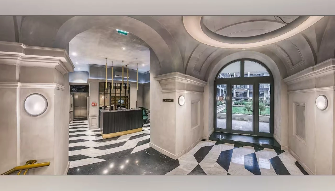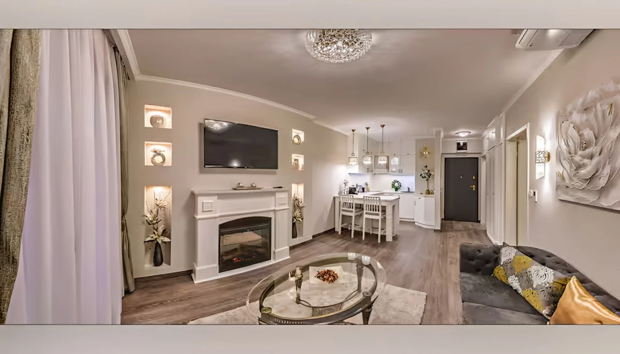 Apartamentul de lux, cu o suprafață de 44 m², este situat la etajul al doilea al unei clădiri moderne. Designul interior îmbină eleganța contemporană cu atmosfera intimă și primitoare. Mobilierul realizat la comandă și materialele premium creează un ambient rafinat.