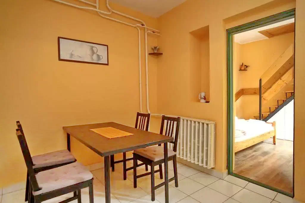 Apartament 5 (4 pers.,se poate solicita pat suplimentar): Apartament cu balcon pentru 4 pers. Galeria este separată de nivelul inferior. Apartamentul are propria bucătărie cu frigider, cuptor cu microunde, ceainic, plită cu inducție sau plită electrică și vase. Apartamentul are o baie privată, TV și WIFI gratuit.