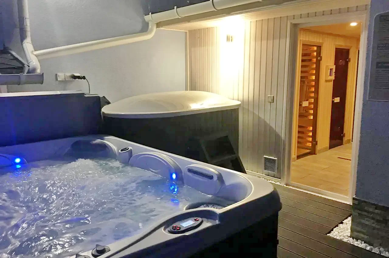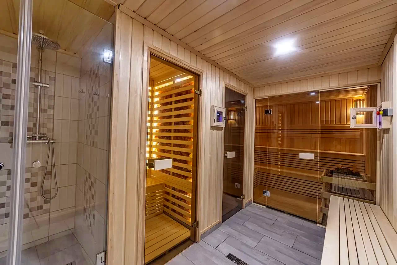 - Saună finlandeză, saună cu infraroșu cu hidromasaj, echipată cu un generator de cabină de sare care are un alt efect fiziologic, în afară de relaxare, cu terapie cu lumină