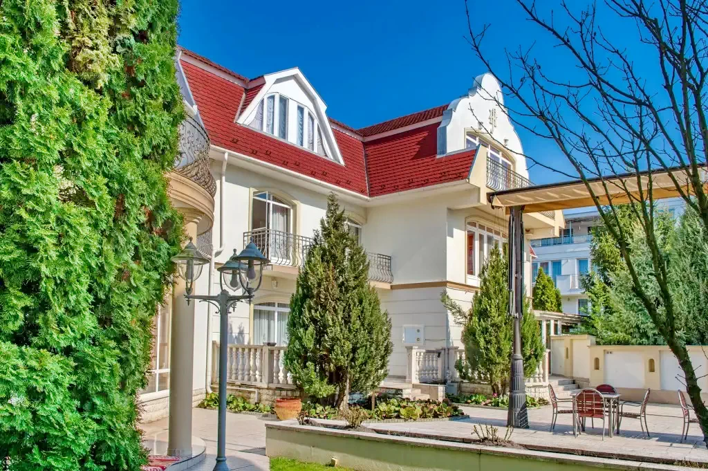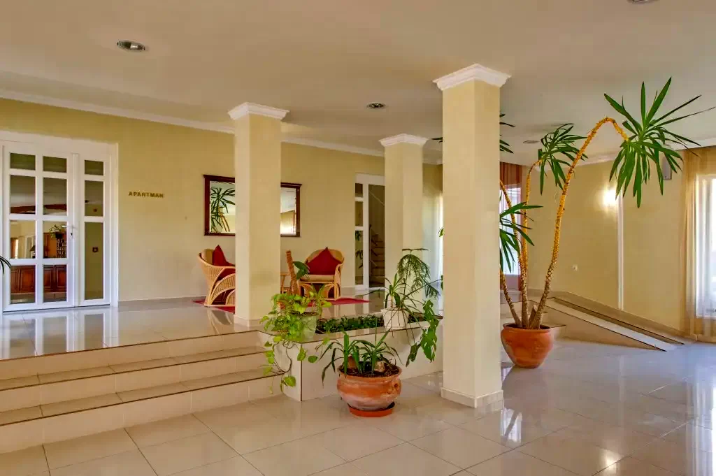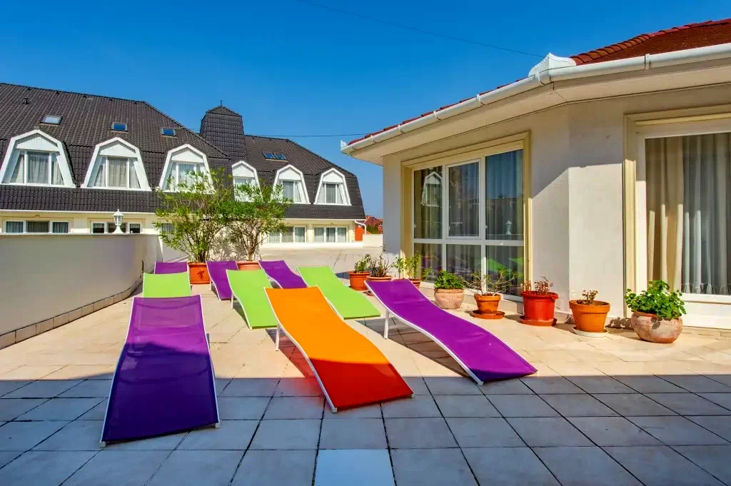 Hotel este elegant în stil mediteranean, cu grădină, grătar, terasă cu sezlonguri, piscine dotate si SPA, saună, baie de aburi, sală de fitness, wellness, restaurant, grădină de bere, 39 camere dotate fiecare cu aer conditionat si 19 apartmane.