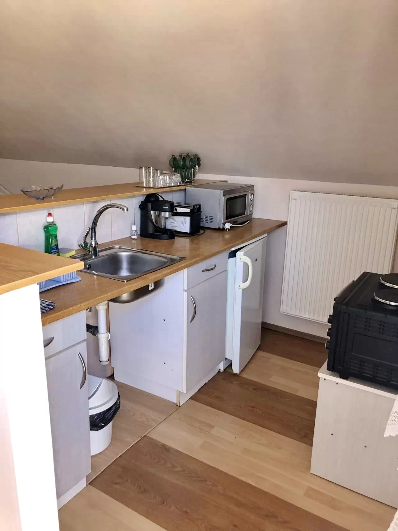 - chicineta (plita electrica, frigider, cuptor cu microunde, cafea, ceainic, farfurii, tacamuri, glasuri stb.)