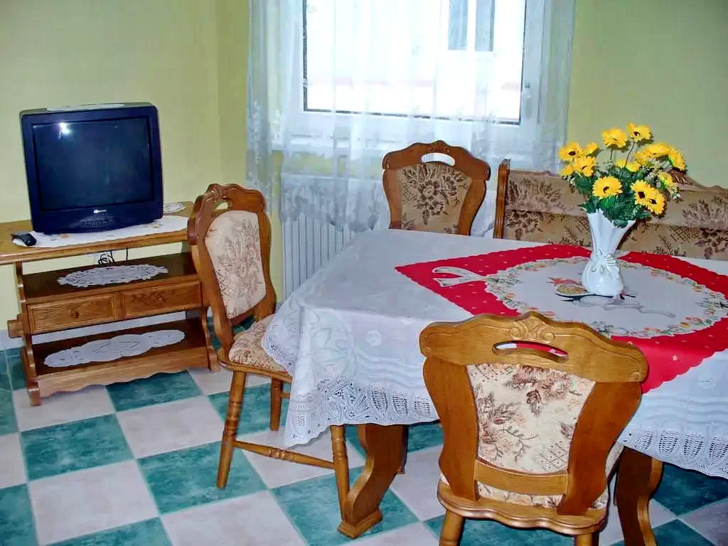 La un apartament pentru 4-6 persoane revine 2 camere, 2 băi, un living, o bucătărie complet utilată si un garaj.