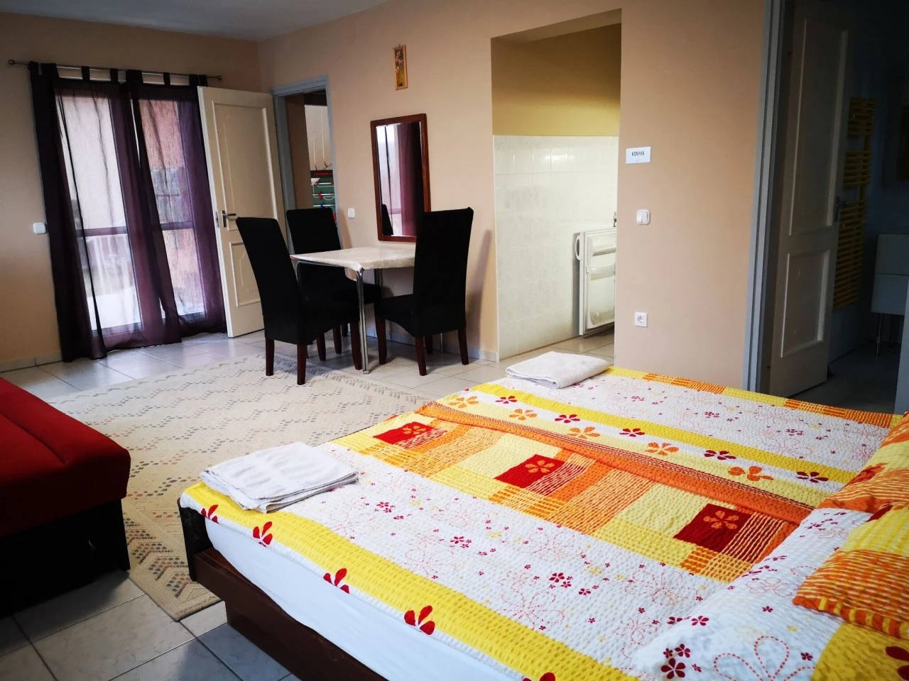 Vă invităm cu drag să vă petreceți vacanța bine-meritată într-un mediu plăcut, liniștit, în apartamentele noastre bine-dotate! Pensiunea noastră este locul ideal pentru relaxare atât pentru tineri, pensionari, cât și pentru familii! Camerele noatre cu 3 paturi sunt dotate cu televizor, baie proprie, WI-FI gratuit, bucătărie/sufragerie dotată cu toate cele necesare: loc pentru gătit, frigider, cuptor cu microunde. Parcare privată în curte! La cerere vă punem la dispoziție pătuț pentru copil, și diverse echipamente necesare pentru cei mici. Pentru copii oferim diverse jucării și loc de joacă în nisip. Pensiunea deține o terasă mare acoperită, loc de joacă pentru copii, trambulină și piscină în aer liber. Accesibilitate: la 300 m distanță față de SPA, la 5 km distanță față de localitatea Zalacsány, și la 18 km distanță față de localitatea Keszthely (localitate pe malul lacului Balaton). Cazare ideală pentru un număr de 17 persoane (pensiunea se întinde pe 100 m2 + 100m2 casă de vacanță) Pensiunea are grădină și posibilitate de parcare private în curte! (900 m2)
