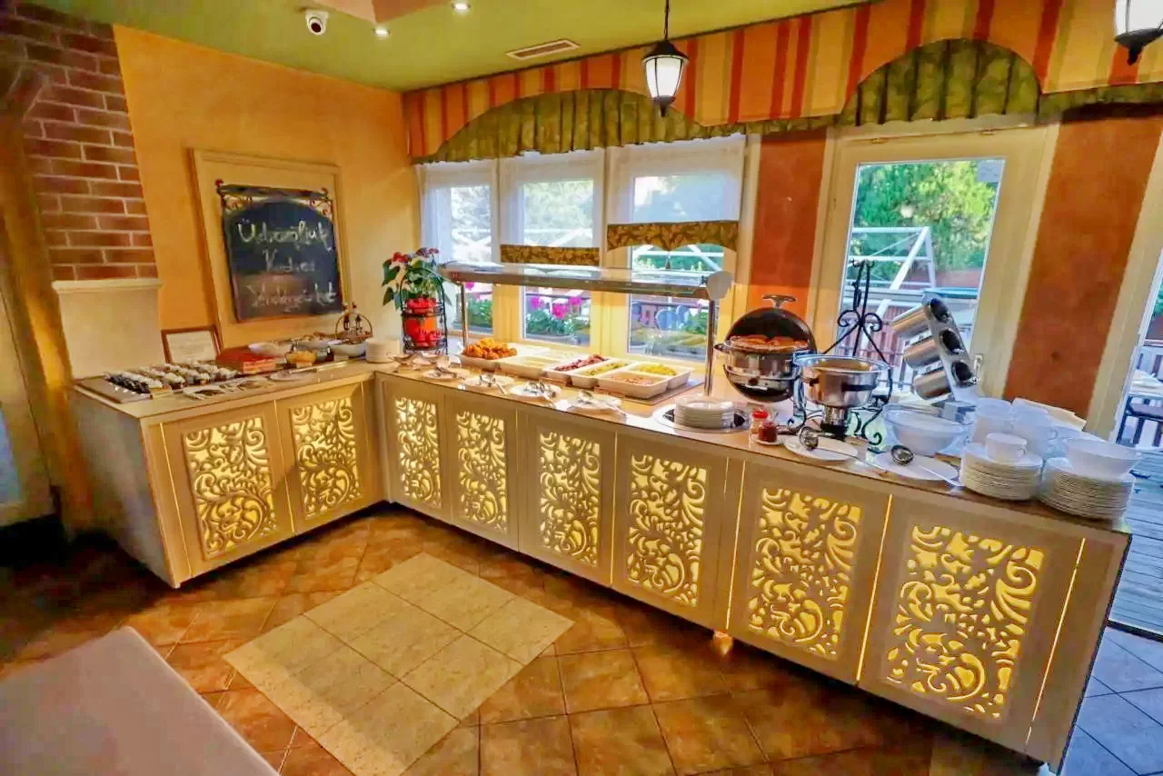 - Mic dejun bogat tip bufet cu șampanie rece la gheață (selecție de mâncăruri calde și reci)