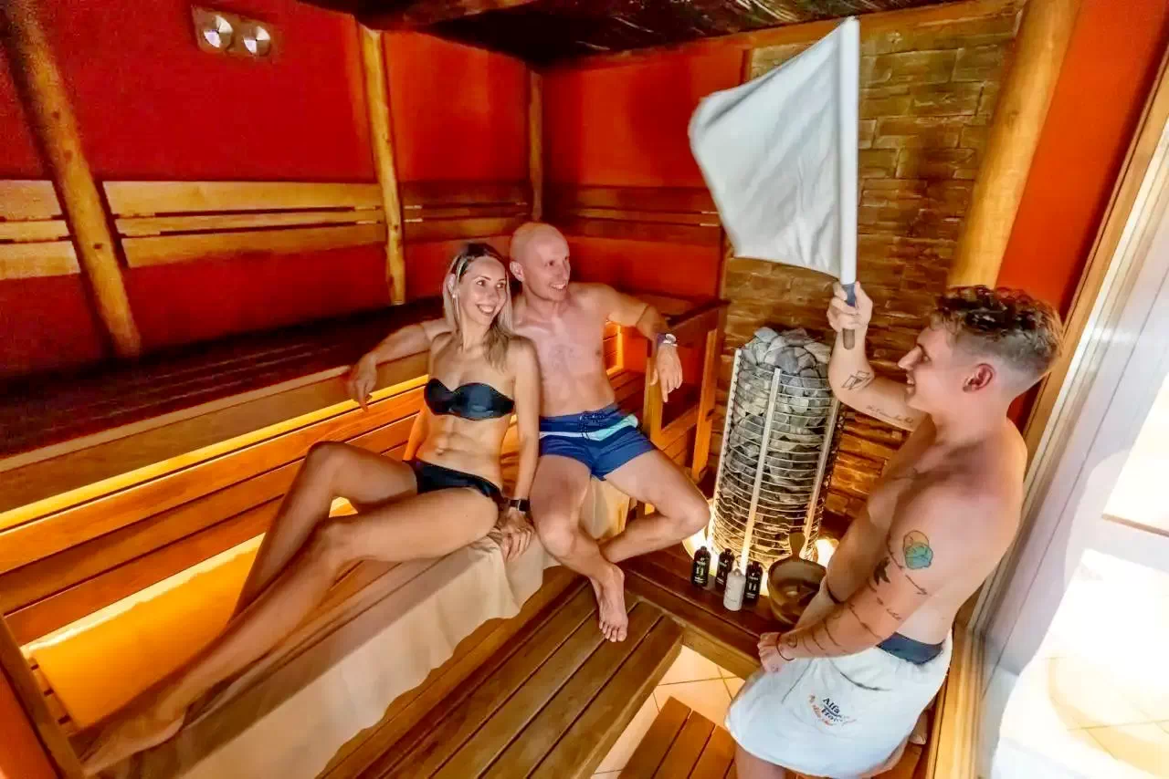 - 2x spectacol de saună zilnic cu maeștri de saună instruiți (cu gheață, bere, miere de sare, vitamină, răcoritoare, toppinguri de mușețel)