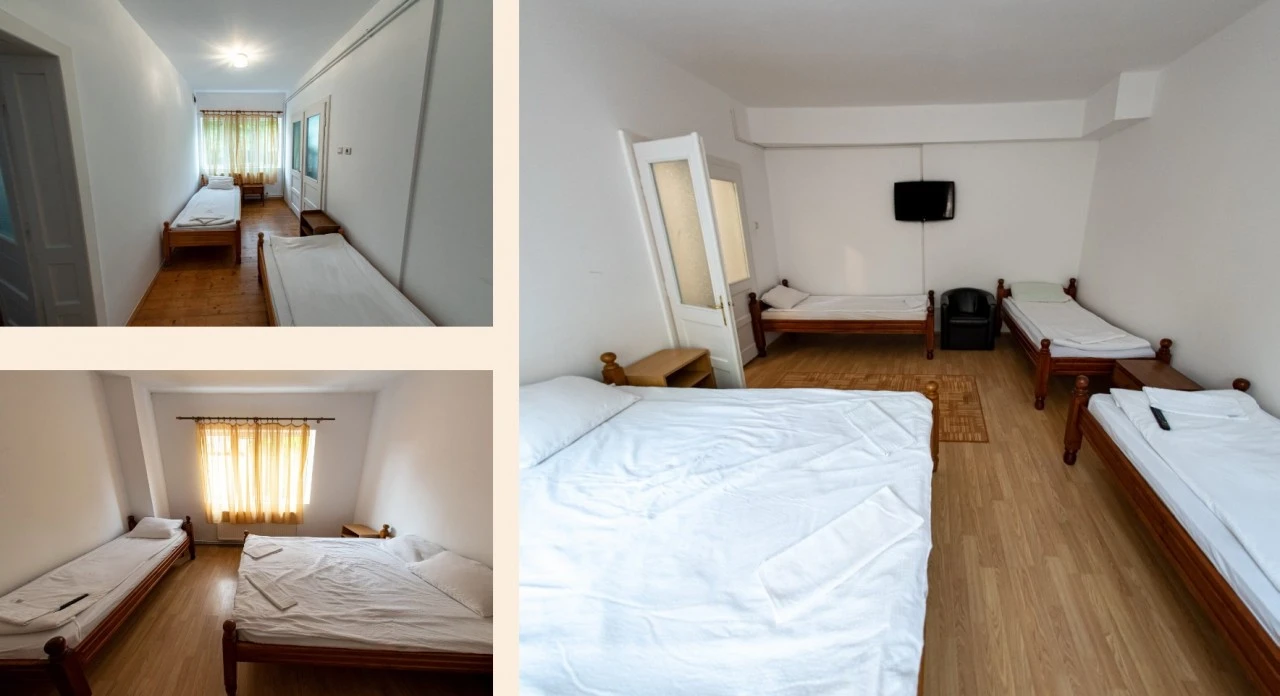 Cazare confortabilă în pensiune cu atmosferă rustică: 2 camere * cu 3 locuri si 4 camere*2 pers la mansarda si la etajul 1: 2 camere cu 3 locuri cu o baie comuna si 2 camere ( cu 2 si cu 5 locuri) cu o baie comuna